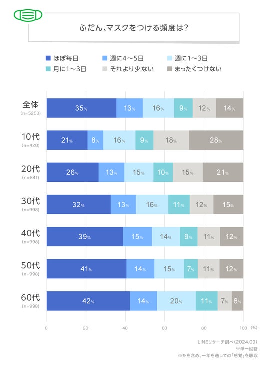 屋内・屋外を問わず、一年を通して普段どのくらいの頻度でマスクをつけているかを聞きました。