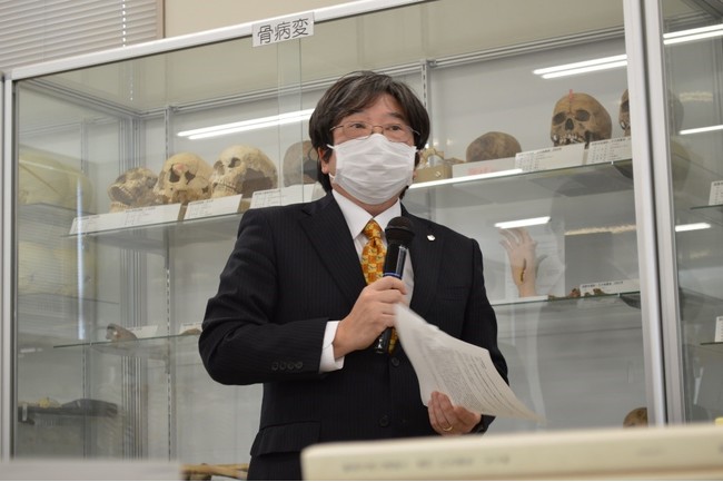 開所式では、2021年11月に新潟県阿賀野市土橋遺跡にて発見された4000年前の縄文時代の人骨や、長岡藩牧野家の藩主と正室の復顔模型を4個体(復元途中)など、本学内の展示資料を所長・奈良貴史教授より解説いただきました。