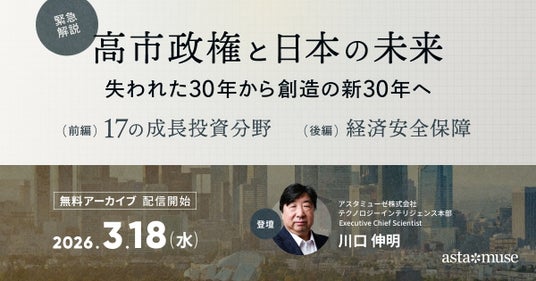 アスタミューゼ株式会社(本社:東京都千代田区、代表取締役:永井歩)は、2026年2月19日および2月26日に開催した緊急解説ウェビナー「高市政権と日本の未来」を、本日2026年3月18日より前後編でアーカイブ配信します。