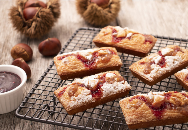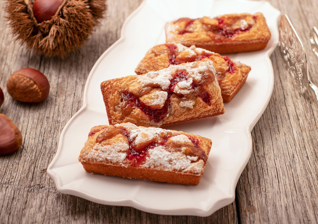 『焼きたてフィナンシェ(フランボワーズマロン)』は、フランボワーズコンフィチュールとイタリア産の栗に上品なバニラ風味をプラスした香り高いマロンクリームを絞り、砕いたマロングラッセを贅沢にトッピングした季節限定のフィナンシェです。 栗の美味しさをギュッととじこめたマロングラッセとマロンクリーム、甘酸っぱいフランボワーズコンフィチュール、アーモンドと焦がしバターの香り豊かなフィナンシェ生地が織りなすハーモニーを、ぜひ、この機会にお試しください。