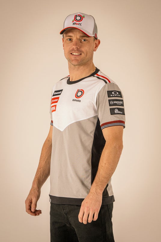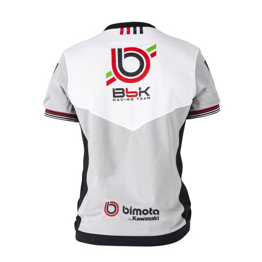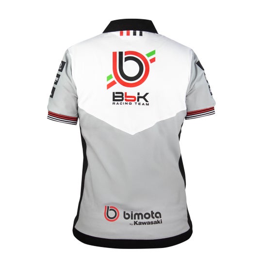 洗練されたホワイトとグレーを基調にしたカラーリングが、上質なスポーティーエレガンスを演出します。フロントと袖には、チームを支えるスポンサーの公式ロゴを巧みに配置。背面には"BbKRT Racing Team"および"bimota by Kawasaki" 2種のチームロゴが大胆にあしらわれ、レーシングスピリットの鼓動を感じさせるデザインに仕上がっています。