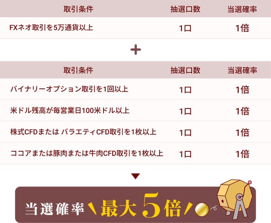 本キャンペーンは12週連続で開催いたします。キャンペーンにエントリーし、キャンペーン期間内に「FXネオ」で5万通貨以上の新規建て取引をされた個人のお客様の中から、毎週抽選で7,000名様に最大2,000円をプレゼントいたします。毎週エントリーが可能なため当選チャンスは最大12回、最大当選額は24,000円です。さらに、CFD取引などの追加条件達成で当選確率は最大5倍になります。