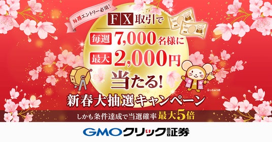 GMOインターネットグループのGMOフィナンシャルホールディングス株式会社の連結会社で、金融商品取引業を営むGMOクリック証券株式会社(本社:東京都渋谷区、代表取締役社長:高島 秀行、以下:当社)は、2025年1月7日(火)より、新たな年の始まりにお客様への感謝の気持ちを込めて「FXネオ5万通貨取引で最大2,000円が当たる新春大抽選キャンペーン」を開始いたします。