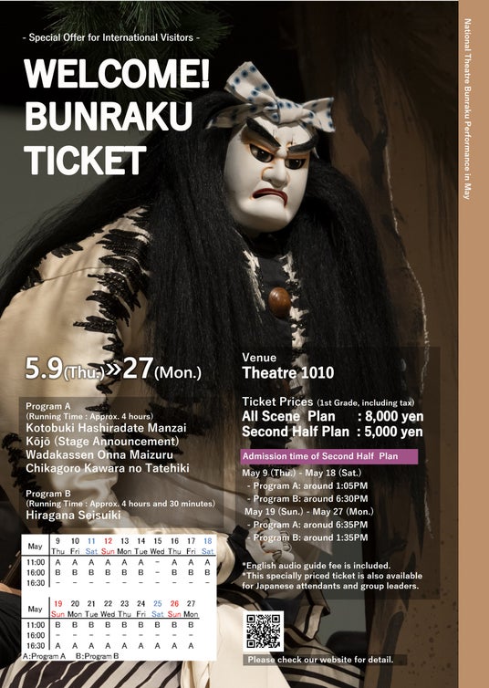 国立劇場主催の2月文楽公演でご好評いただきました外国人のお客様向けの特別プラン「WELCOME! BUNRAKU TICKET」。5月文楽公演では、たっぷりご堪能いただける“フル観劇プラン”、短時間でお手軽にお楽しみいただける“幕見プラン”の2つのプランをご用意いたしました。