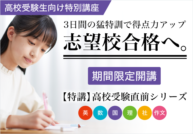 高校受験直前期に自宅で取り組める短期集中講座を開講します。入試で頻出の2テーマ分の演習問題を厳選して出題。苦手教科の底上げにぜひご受講ください。
