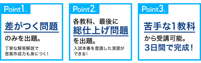 1教科3日間を目安に対策できるよう問題を厳選。1教科から受講が可能なため、短期集中で苦手対策ができます。