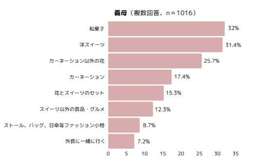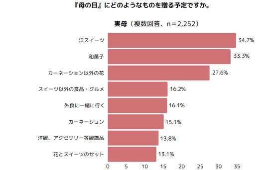 ・贈る予定のものは、実母は、1位「洋スイーツ」、2位「和菓子」、3位「カーネーション以外の花」、義母は、1位「和菓子」、2位「洋スイーツ」、3位「カーネーション以外の花」。昨年に続き、実母・義母ともにスイーツカテゴリが人気。(複数回答)