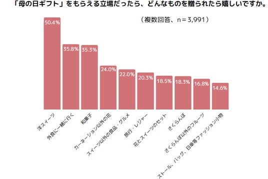 自分がもらって嬉しい母の日ギフトについて尋ねたところ、贈りたいものと同様に「洋スイーツ」や「和菓子」がお花をおさえてトップ3以内にランクインしました。また、「外食に一緒に行く」と回答した方が、昨年よりわずかに増加し2位にランクイン(昨年比1.9ポイント増)。母の日には“美味しいものを囲んで特別な時間を過ごしたい”という傾向が見られます。