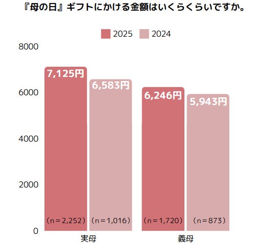 ・購入予算の平均額は、実母7,125円(前年比+542円)、義母6,246円(前年比+303円)とともに増加傾向。