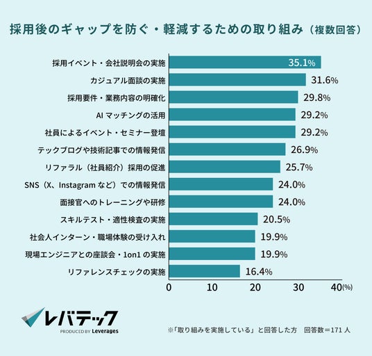 具体的な施策としては、「採用イベント・会社説明会(35.1%)」「カジュアル面談の実施(31.6%)」「採用要件・業務内容の明確化(29.8%)」など、採用プロセスの改善を行う動きが広がっています。「AIマッチングの活用(29.2%)」も上位にランクインしており、AIを活用することで採用時と入社後のギャップを事前に予測し、候補者と企業のミスマッチを減らすための工夫が進められていることがうかがえます。