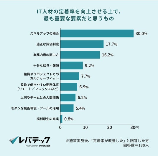 定着率を高める上で最も重要な要素として多く挙げられたのは、「スキルアップの機会(30.0%)」でした。ついで、「適正な評価制度(17.7%)」「業務内容の面白さ(16.2%)」と続き、IT人材の定着には金銭的な報酬だけでなく、成長実感や評価に対する納得感といった要素が大きく影響していることがうかがえます。