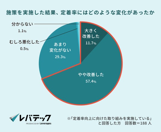 実施後の効果として、「やや改善した(57.4%)」「大きく改善した(11.7%)」と、7割近くの企業が定着率の改善を実感していることがわかりました。