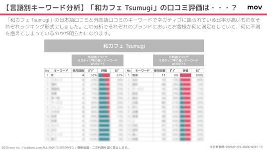 「和カフェ Tsumugi」の日本語口コミと外国語口コミのキーワードでネガティブに語られている比率が高いものをそれぞれランキング形式にしました。この分析でそれぞれのブランドにおいてお客様が何に満足をしていて、何に不満を抱えてしまっているのかが明らかになります。