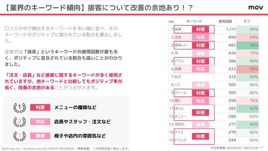 全体では「抹茶」というキーワードの使用回数が最も多く、ポジティブに言及されている割合も高いことがわかりました。