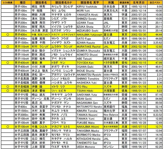 ■セイコーGGP 国内選手エントリーリスト ※3月17日現在