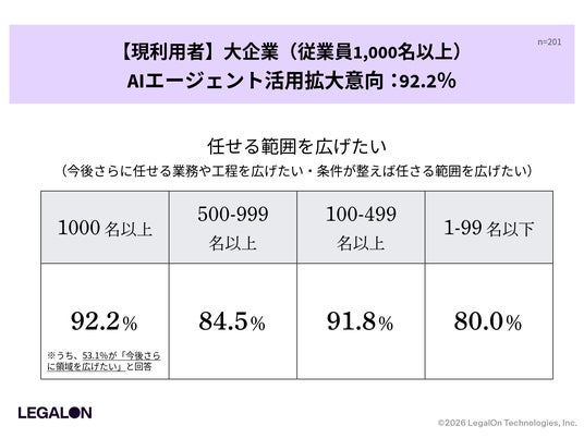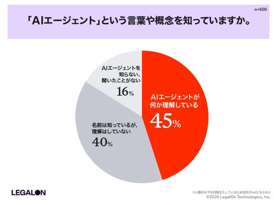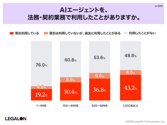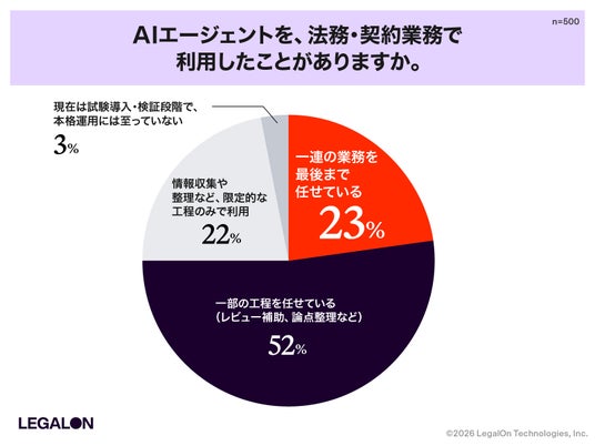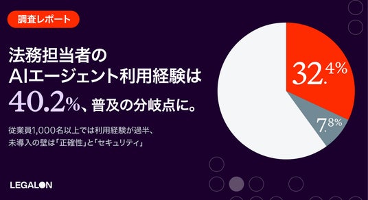 株式会社LegalOn Technologies(本社:東京都渋谷区、代表:代表取締役 執行役員・CEO 角田 望、以下:LegalOn Technologies)は、企業に所属し日常業務として法務業務に関与している会社員および会社役員500名を対象に、法務業務におけるAIエージェント活用の実態調査を実施しました。