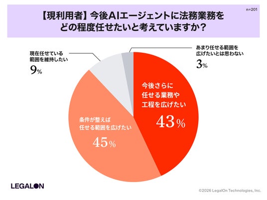 続いてAIエージェントの利用経験がある層に対し、その活用範囲を尋ねたところ、「一部工程を任せている」が52%で最多でした。契約書レビュー補助や論点整理など、業務プロセスの一部をAIに委ねる「部分委任」が中心となっています。一方、「一連の業務を最後まで任せている」は23.4%と約4分の1に達しており、全面的な活用に踏み込む企業も一定数存在しています。
