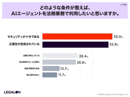 さらに導入条件としても「情報漏洩などセキュリティ懸念の解消(55.9%)」と「正確性の担保(52.8%)」が最重要視されており、未導入理由と導入条件が一致する結果となりました。これは、法務領域におけるAIエージェント普及の鍵が「信頼性(正確性)」と「安全性(セキュリティ)」にあることを示しています。