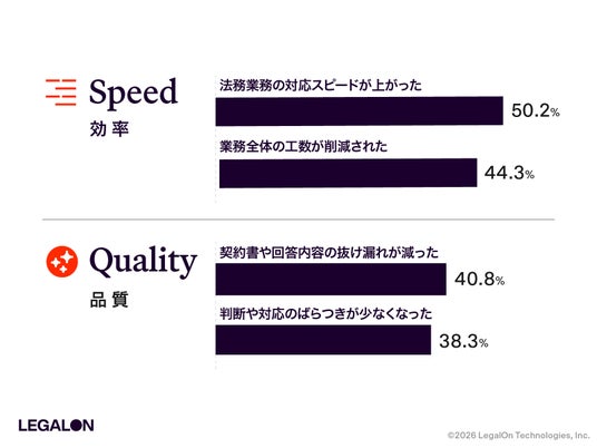 AIエージェント導入によって実感された効果について問うと、上位には「法務業務の対応スピードが上がった(50.2%)」「業務全体の工数が削減された(44.3%)」など、いわゆる処理スピードに関する項目が挙げられました。加えて、「契約書や回答内容の抜け漏れが減った(40.5%)」「判断や対応のばらつきが少なくなった(38.3%)」といった品質担保に関する回答も多く、AIエージェントが「効率化」と「リスク低減」の双方に寄与していることが確認されました。