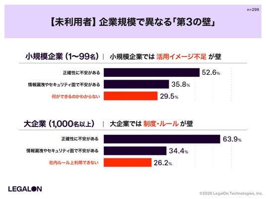 企業規模別に見ると、小規模企業では「何ができるかわからない」「法務で利用するイメージがわかない」といった理解不足が相対的に課題となる一方、大規模企業では「社内ルール上利用できない」が目立ち、セキュリティやガバナンス整備が導入のボトルネックとなる傾向が見られました。