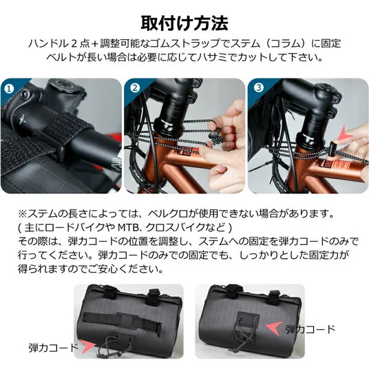4点固定方式(ハンドル2点+ステム1点、ステム補強固定: 1点(弾力コード)