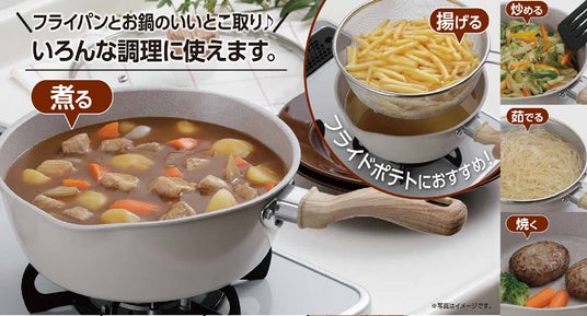 同時に販売中の「IH対応 そのまま食卓に出せるフライパン3点セット」は取っ手が取れるフライパンで、お皿のような色と質感なので、調理後は取っ手を外してそのまま食卓に出すことができます。