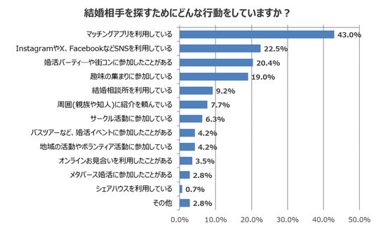 一方で、「特に何もしていない」と回答した人を除き具体的な行動をしている人の活動を見たところ、「マッチングアプリを利用している」(43.0%)が最も多く、次いで「InstagramやX、FacebookなどSNSを利用している」(22.5%)でした。「マッチングアプリ」「SNS」の両方、またはいずれかを使っている人(n=86)は、全体の60.6%に当たります。