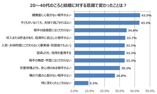 最も多かったのは「健康面に心配がない相手がよい」(43.5%)で、僅差で「子どもがいなくても、夫婦で過ごせればよい」(43.1%)が続きました。