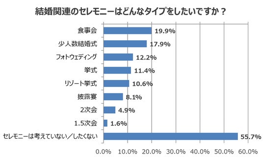 独身ミドル・シニア世代が開催したいセレモニーとしては、「食事会」(19.9%)、「少人数結婚式」(17.9%)、「フォトウェディング」(12.2%)が上位となっています。一方で、「セレモニーは考えていない/したくない」人がおよそ半数を占めました。