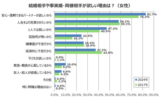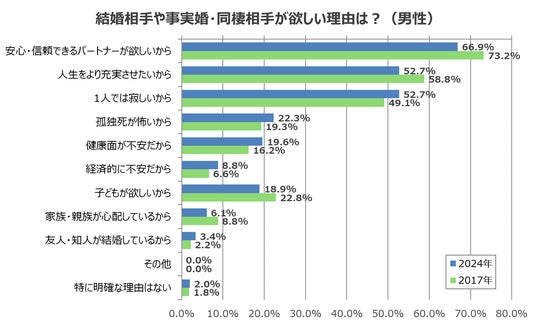 ・結婚相手を求める理由「安心・信頼できるパートナーが欲しい」がトップ、7年前に比べて「孤独死」に不安感