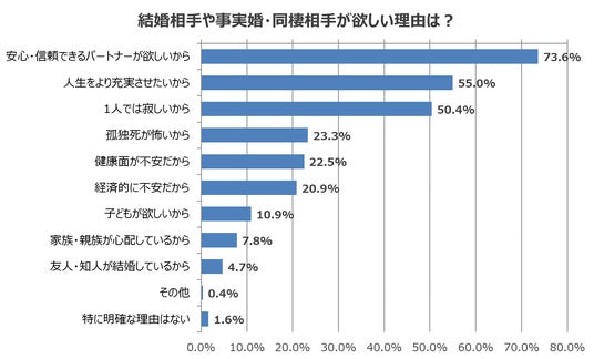 結婚相手または事実婚・同棲相手が欲しいと回答した人に、その理由を聞いてみました。最も多かったのは「安心・信頼できるパートナーが欲しいから」で73.6%でした。他に半数以上の人が、「人生をより充実させたいから」(55.0%)、「1人では寂しいから」(50.4%)という理由をあげています。