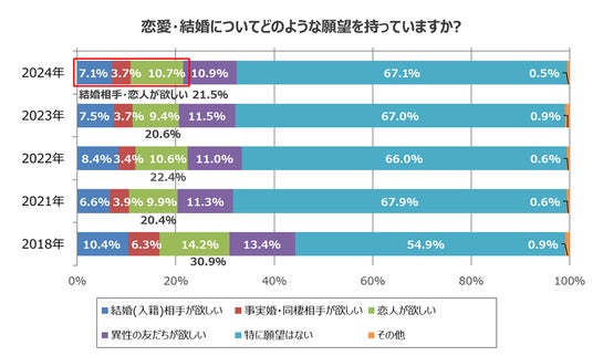 独身ミドル・シニア世代に恋愛・結婚に対する考えを聞いたところ、「恋人が欲しい」人は10.7%、「結婚(入籍)相手が欲しい」人は7.1%、「事実婚・同棲相手が欲しい」人は3.7%でした。「結婚相手・恋人が欲しい」と考える独身ミドル・シニア世代は21.5%で、昨年と比べると0.9ポイント増加しています。