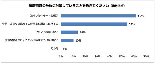 渋滞回避のための対策について尋ねたところ、1位は「渋滞しないルートを選ぶ」62%、2位は「早朝・深夜など混雑する時間帯を避けて出発する」54%となり、3位以下の「クルマで移動しない」14%と大きく差がつきました。