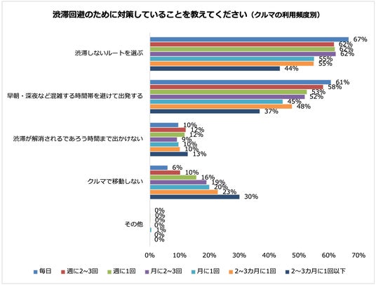 クルマの利用頻度別に見ると、「毎日」クルマを利用する人のみ「渋滞しないルートを選ぶ」と「早朝・深夜など混雑する時間帯を避けて出発する」の渋滞回避対策がいずれも6割以上になりました。また、クルマの利用頻度が低い人ほど、渋滞回避として「クルマで移動しない」を選択する割合が高い一方で、日常的にクルマをよく使う人は渋滞の有無に拘らずクルマで移動する傾向にあることがわかりました。