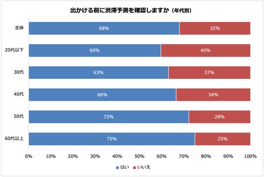 お出かけ前に渋滞予測を確認するドライバーは全体の68%でした。年代別に見ると、年代が上がるにつれて渋滞予測を確認する人が増え、20代以下と60代以上では15ポイントの差がつきました。年代が高い人ほど渋滞の有無を意識する人が多いようです。