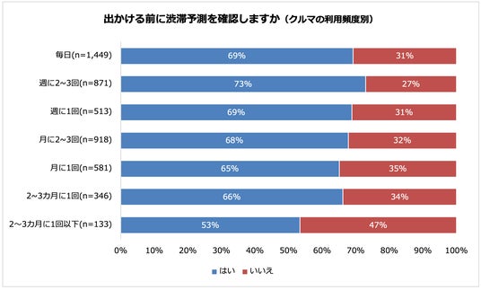 クルマの利用頻度別に見ると、利用頻度が「2~3カ月に1回以下」のみ、渋滞予測を確認する人が60%を下回りました。