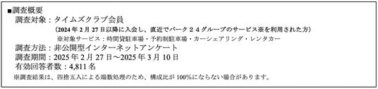 ※入会金・年会費無料の会員制ポイントプログラム。タイムズパーキングやタイムズカー、タイムズカーレンタルの利用等でポイントがたまる他、会員限定サービス等を提供。会員数1,234万人(2025年3月末現在)。なお、本アンケートは、駐車場やカーシェアリング、レンタカー等のクルマに関わるサービスを利用した方々を対象としたものです。