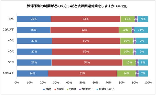 渋滞予測の時間がどのくらいであれば渋滞回避対策をするか尋ねると、「1時間」53%、「30分」26%、「2時間」11%の順に多くなりました。年代による大きな違いは見られず、どの年代も渋滞予測が「1時間」を超えると、半数が対策を講じることがわかりました。一方、渋滞予測の時間によらず、「渋滞対策をしない」と回答した人は全年代で10%程度にとどまりました。