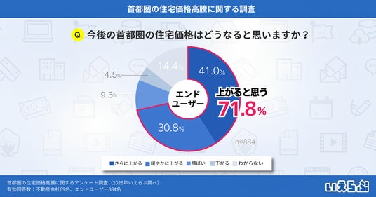 エンドユーザーに「今後の首都圏の住宅価格はどうなると思いますか?」という質問をしたところ、「さらに上がる」(41.0%)、「緩やかに上がる」(30.8%)、「横ばい」(9.3%)、「下がる」(4.5%)、「わからない」(14.4%)という結果となりました。