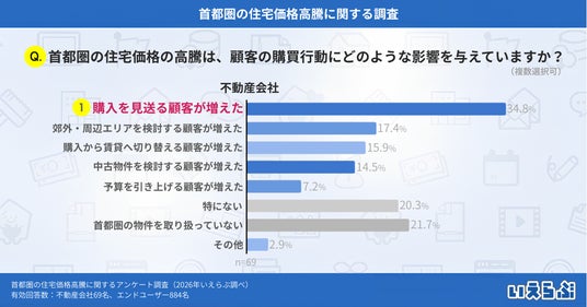 次に、不動産会社に対し、価格高騰による影響を尋ねたところ、「購入を見送る顧客が増えた」が34.8%と最も多く、首都圏の住宅価格高騰が、顧客の購買行動に影響を与えていることがうかがえます。