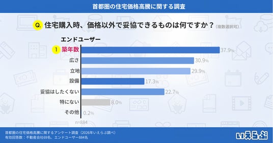 住まい探しへの影響についての回答を受け、エンドユーザーに「住宅購入時、価格以外で妥協できるポイントはどこですか?」と質問したところ、「築年数」が37.9%で最も多く、次いで「広さ」が30.9%、「立地」が29.9%という結果となりました。