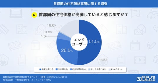 エンドユーザーに「首都圏の住宅価格が高騰していると感じますか?」と質問したところ、「非常に感じる」(51.5%)、「やや感じる」(26.5%)、「あまり感じない」(4.6%)、「まったく感じない」(0.8%)、「わからない」(16.6%)という結果となりました。