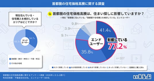 現在「首都圏に住んでいる」「首都圏で住宅購入を検討している」と回答したエンドユーザー(※2)に「首都圏の住宅価格高騰は、住まい探しに影響していますか?」と質問したところ、「大きく影響している」(41.4%)、次いで「ある程度影響している」(35.8%)、「あまり影響していない」(9.1%)、「まったく影響していない」(3.9%)、「高騰前に購入済み」(9.8%)という結果となりました。