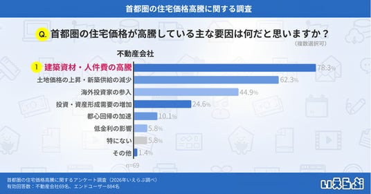 不動産会社に「首都圏の住宅価格が高騰している主な要因は何だと思いますか?」と質問したところ、「建築資材・人件費の高騰」が78.3%で最も多く、次いで「土地価格の上昇/新築供給の減少」が62.3%、「海外投資家の参入」が44.9%という結果となりました。
