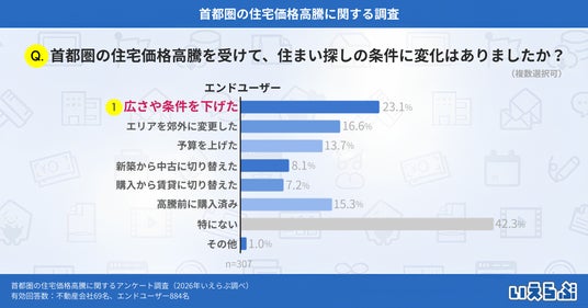 現在「首都圏に住んでいる」「首都圏で住宅購入を検討している」と回答したエンドユーザーへの「首都圏の住宅価格高騰を受けて、住まい探しの条件に変化はありましたか?」という質問では、「特にない」が42.3%で最も多い結果となりました。