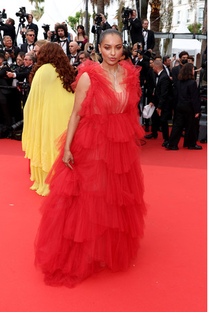 女優のカテリーナ・グレアムは、ディオールのオートクチュールコレクションより、赤のチュールドレスを纏い登場。