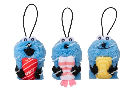 スンスンがおすしのネタをギュッと抱えており、指人形としても遊ぶことができるコラボ限定指人形マスコットです。
