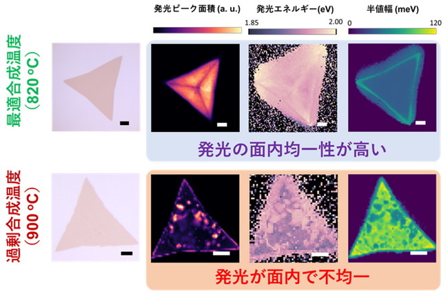 異なる合成温度(上段: 820℃、下段: 900℃)で合成したWS2の顕微鏡写真と発光特性マッピング。左から発光ピーク面積、発光エネルギー、半値幅。