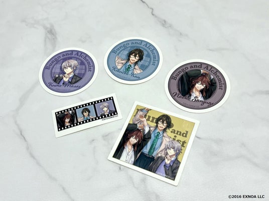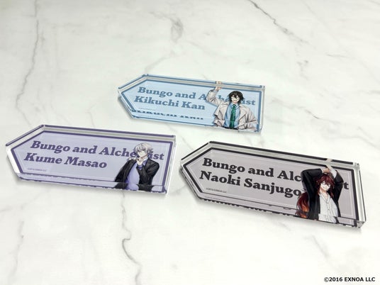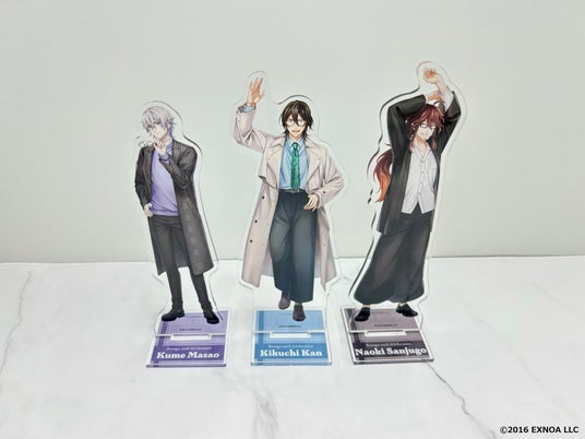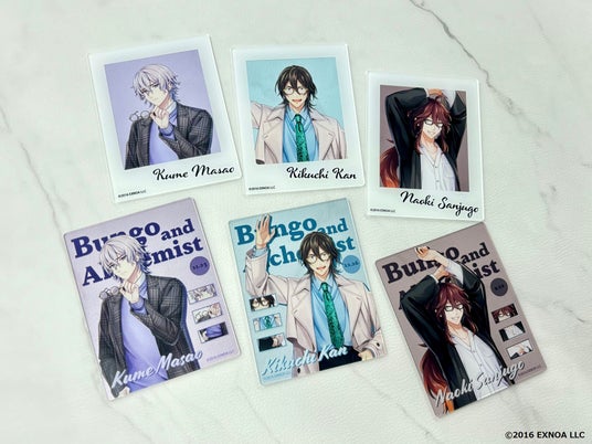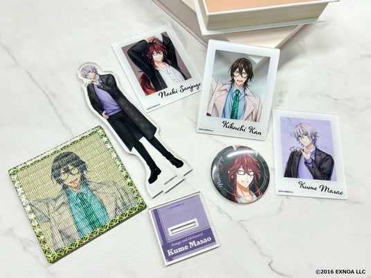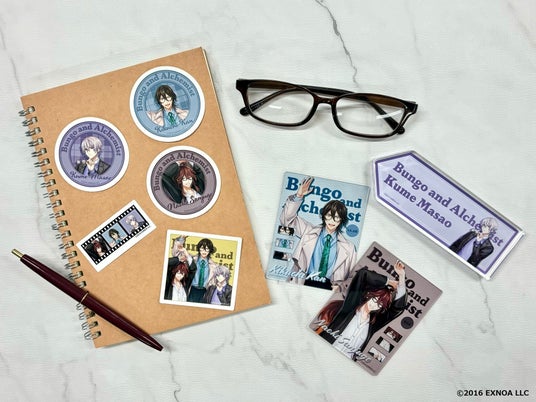 メガネをかけた久米正雄たちの等身描き下ろしイラストを使って、内容盛りだくさんで登場した『文豪とアルケミスト』の新作グッズ。