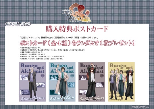 今回発売した『文豪とアルケミスト』の新作グッズを含む関連商品を2,200円(税込)お買い上げごとに、ポストカード(全4種)をランダムで1枚プレゼントします。